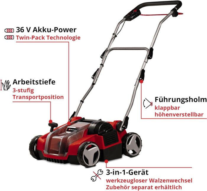 • Starke Leistung – Mit 36 V Akku-Power entfernt das Gerät kraftvoll Moos, Unkraut und Rasenfilz, damit die empfindlichen Rasenwurzeln Wasser und Sauerstoff besser aufnehmen können.